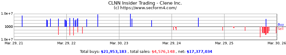 | 2026-02-03 Sale | 2026-02-05 10:18 am | Clene Inc. | CLNN | Ugwumba Chidozie 10% Owner | 5,559 | $4.1 | $22,792 | 550,000 (Indirect) | View |