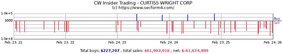 | 2026-02-04 Sale | 2026-02-05 4:24 pm | CURTISS WRIGHT CORP | CW | Bamford Lynn M Chair and CEO | 9,327 | $626.45 | $5,842,899 | 46,192 (Direct) | View |